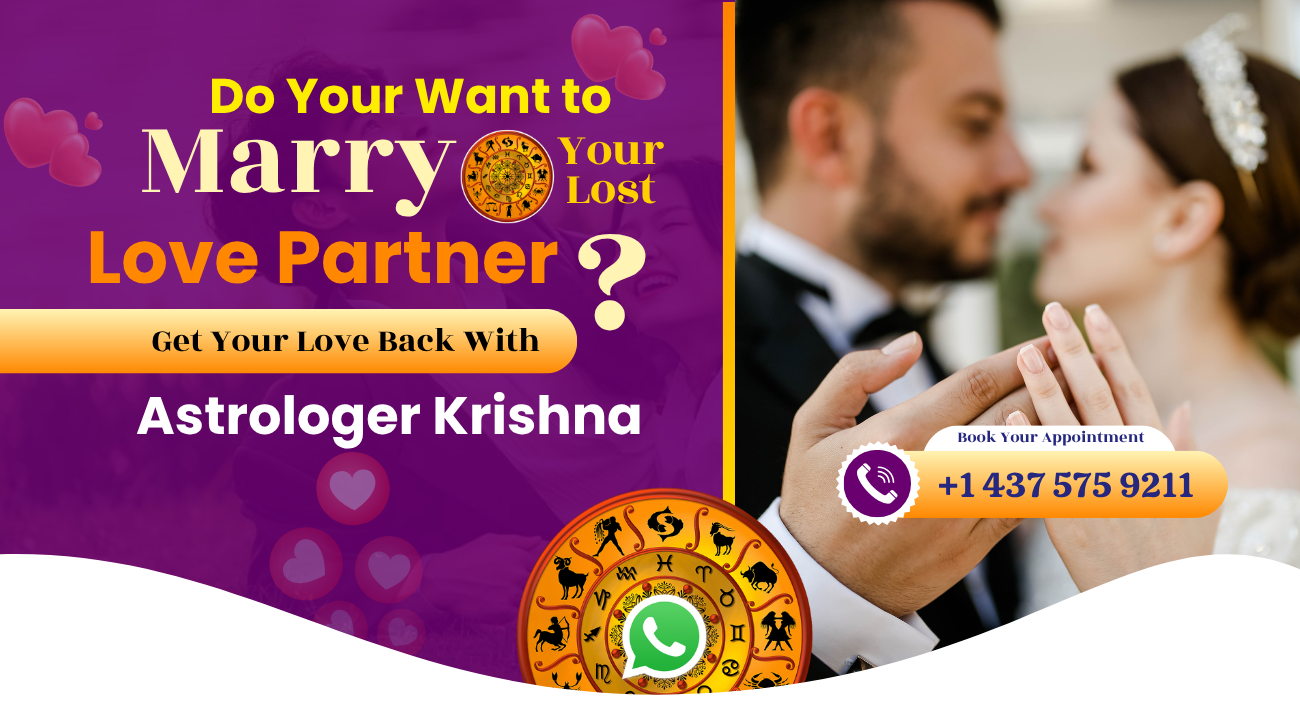 Astrologer Krishna is recognized as the best love back expert in Canada, helping countless individuals reunite with their lost partners through the divine power of astrology. With deep knowledge of Vedic techniques and spiritual remedies, he understands the emotional pain that comes with separation and heartbreak. His compassionate approach and accurate readings allow him to identify the root cause of relationship issues and provide effective, personalized solutions to bring love and harmony back into your life.